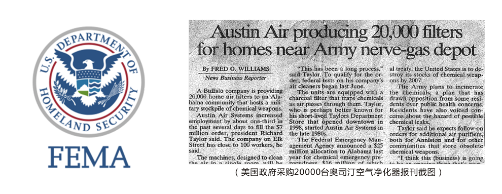 2003年 美國政府根據國際條約,需銷毀Alabama州Anniston軍事基地的上千噸神經毒劑和芥子氣等化學物質。因擔心化學物質可能泄漏帶來的危害,這項計劃受到關注公共健康居民的反對。為此,根據巴特爾紀念研究所的嚴格檢測結果,美國聯邦緊急事務管理局(FEMA)啟動應急計劃,為該軍事基地附近的家庭采購20000臺奧司汀空氣凈化器,以保障居民身體健康。